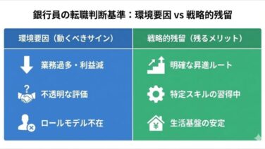 転職 【地銀30代へ】銀行員の転職は「やめとけ」と言われる5つの理由と「辞めるべき人・進むべき人」の決定的な違い ―― 「年収580万円」を失うリスクを避けるための冷静な判断軸もしあなたが今、「銀行員 転職 やめとけ」と検索しているなら、それは非常に冷静で正しい行動です。転職はあなたの人生を変える大きな決断であり... 2025.12.20 転職